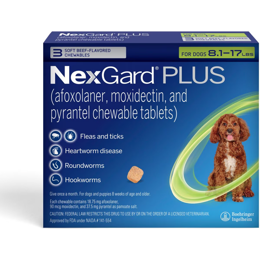 NexGard® PLUS (afoxolaner, moxidectin, and pyrantel chewable tablets) is the one you want for one-and-done monthly parasite protection for your dog. It gives you the power to protect your dog from fleas and ticks, PLUS heartworm disease, roundworms, and hookworms – all in a delicious, beef-flavored, soft chew. NexGard® PLUS chews are safe and approved for puppies as young as 8 weeks old. From the maker of #1 veterinarian-recommended HEARTGARD® Plus (ivermectin/pyrantel)